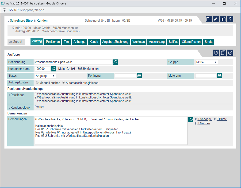 Schreiners Büro läuft direkt in Ihrem Browser. Hier können Sie sich Schreiners Büro als voll funktionsfähige Demo ansehen und in allen Funktionen (Angebot bis Rechnung, Zeiten buchen, Kalkulation usw.) ausgiebig testen.